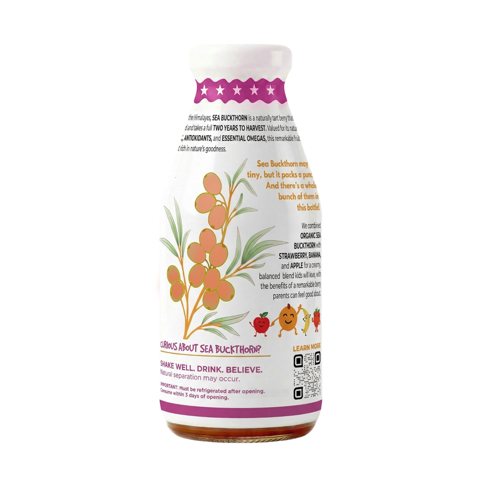 - The World’s Only Sea Buckthorn Drink for Kids – Delivers rare Omega-7, antioxidants, and essential vitamins to support healthy growth of both mind and body.